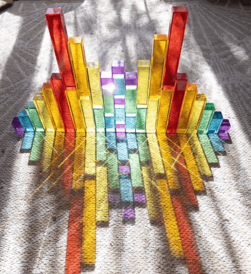這組令人驚豔的 36 件 Lucite 群山積木,為孩子帶來無限的遊戲與學習可能。由於積木具有高度透明與清澈的特性,孩子可以在陽光充足的地方遊玩,無論是室內或戶外都非常適合。當陽光穿透積木時,Lucite 彩虹積木會呈現出絕美的光影效果,令人目不轉睛。