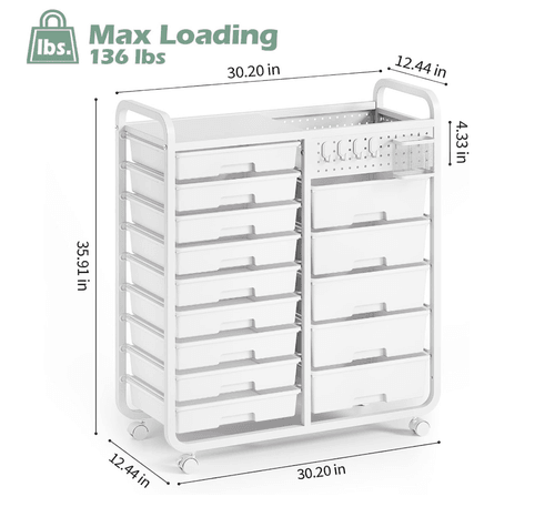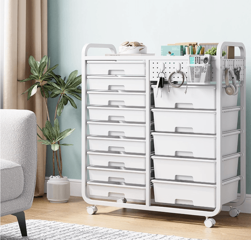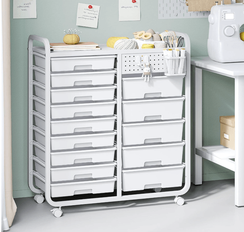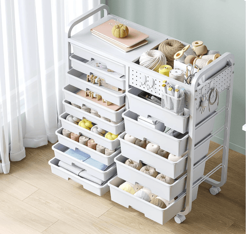 這款多層抽屜推車配有堅固的平面,可立即用於手作、擺放日常用品或工作空間使用。上方設有深層大籃,可放置紙捲、削鉛筆機等等體積較大的物品。