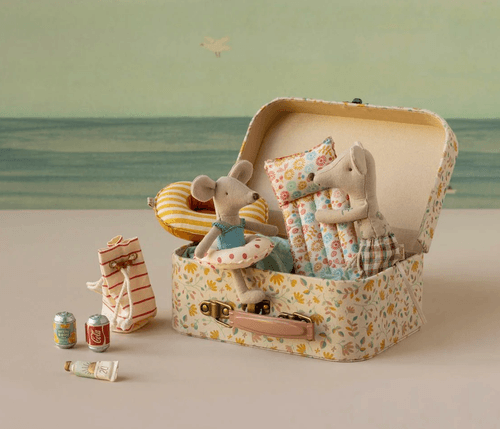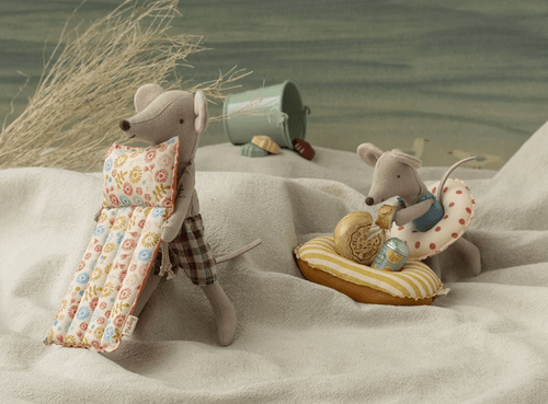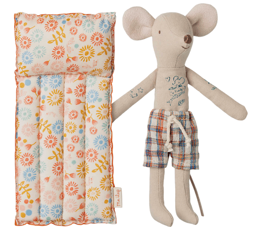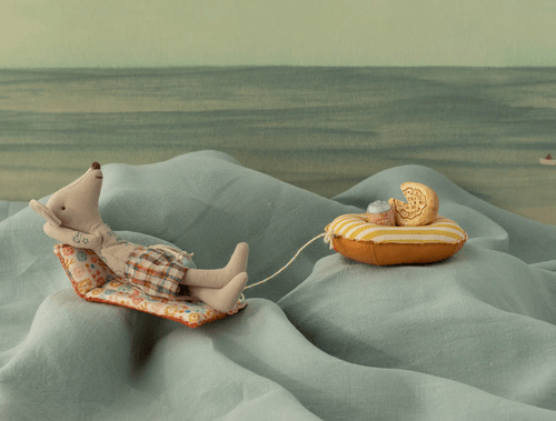 鼠爸爸準備好展開一場愜意的海邊假期。穿著格紋泳褲,搭配充滿航海風格的刺青細節,悠閒享受陽光時光。附有圖案設計的沙灘充氣床,無論是休息或角色扮演,都能帶來豐富的想像樂趣。