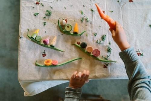 這些手工彩繪的木製蔬菜,把花園裡最新鮮的收穫帶進遊戲時光。爽脆的胡蘿蔔、飽滿的番茄、翠綠的葉菜,邀請孩子切切看、分分類、拌一拌各種料理,鼓勵象徵性遊戲的發展。