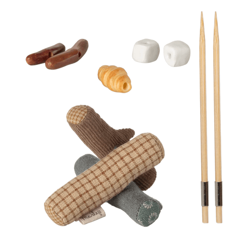 當小老鼠外出健行時,最期待的就是圍著營火準備美食的時光。這組營火配件包含樹枝、食物與木柴,讓露營情境更加完整有畫面。