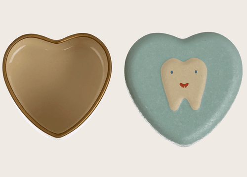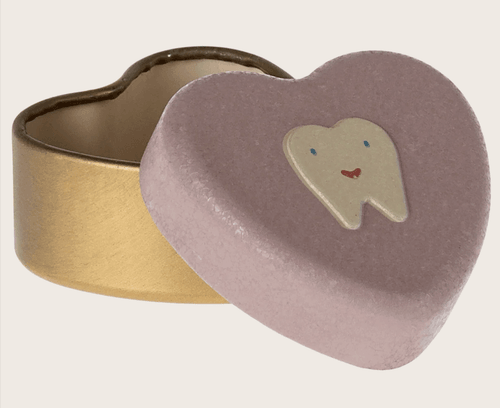 這款金屬愛心盒是保存小小乳牙的完美容器,能讓珍貴的童年回憶長久留存。盒蓋上有可愛的牙齒浮雕,並採用特殊的裂紋質感表面設計。