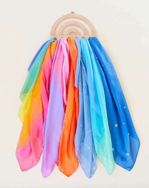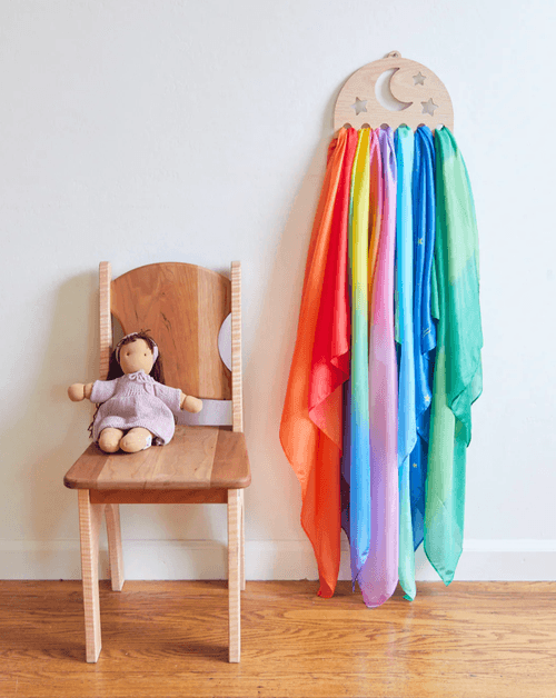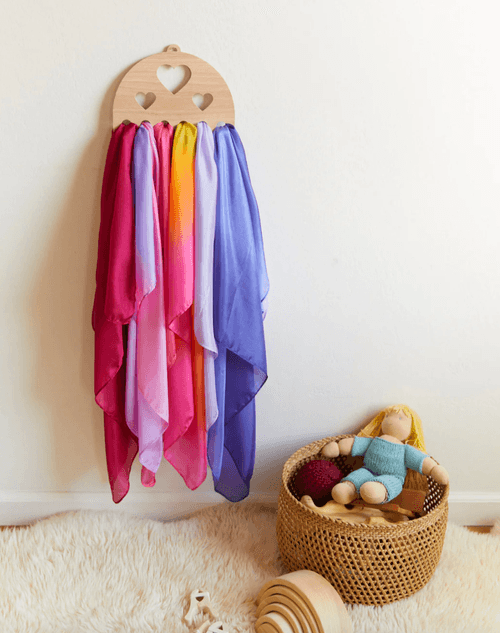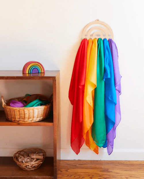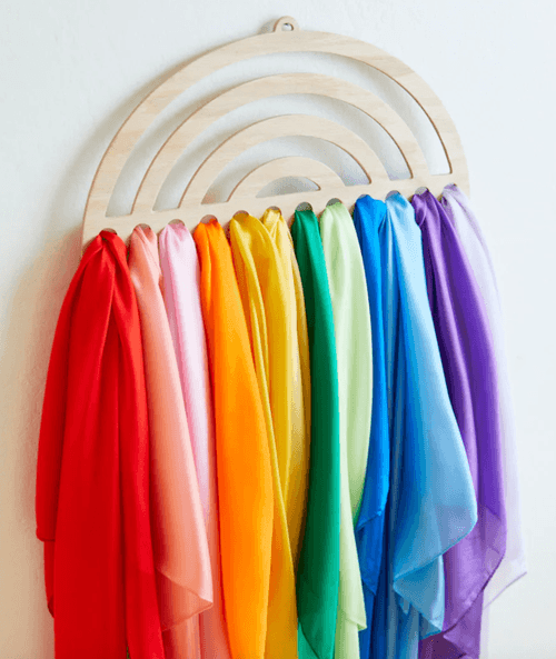 絲巾展示架設計簡約又夢幻,不但能讓孩子輕鬆學習整理與收納,也能讓遊戲空間瞬間升級成療癒童趣的彩虹角落。把絲巾一條條掛上,就像是把小星星串起來的魔法儀式~