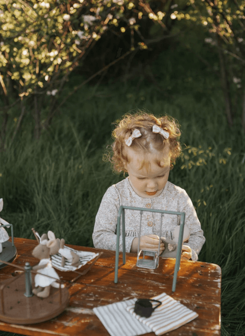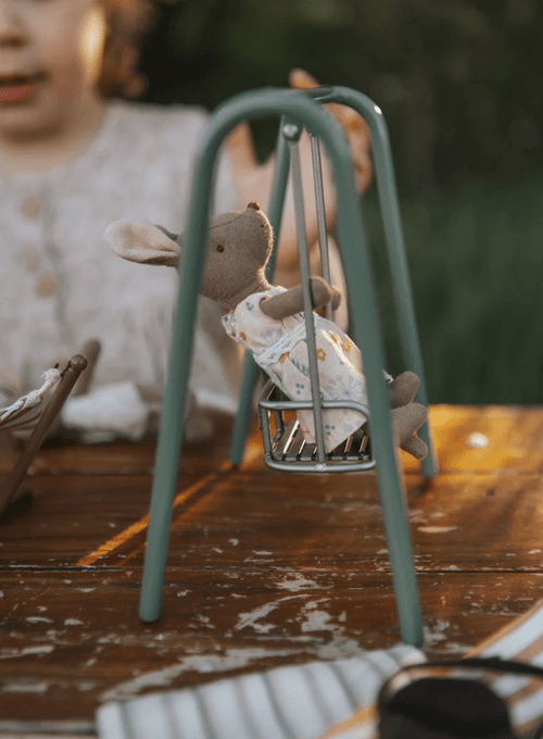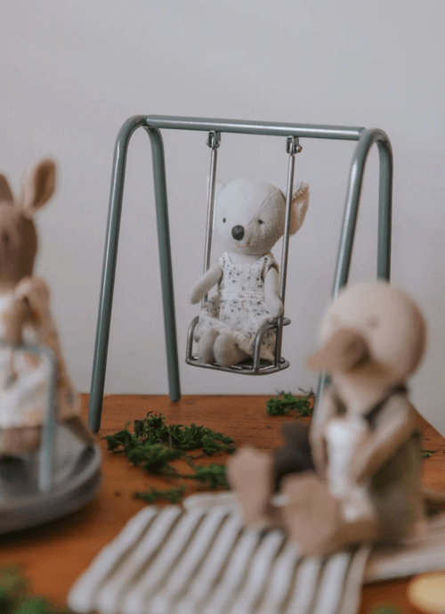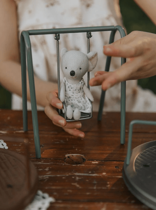 鞦韆採用耐用的實心金屬製作,比例精準、結構穩固,能長久陪伴孩子進行想像遊戲與故事創作。不論是放進娃娃屋、擺設於嬰幼兒房層架,或作為日常遊戲的一部分,這款迷你鞦韆都是完成 Rugaroo Wilds 世界的重要角色。