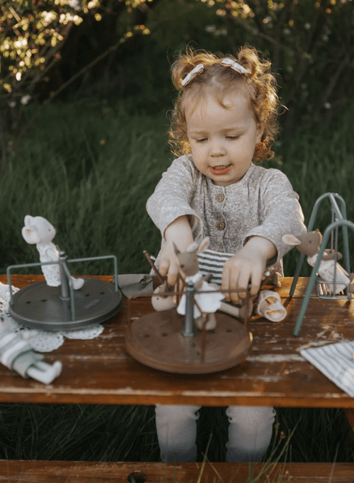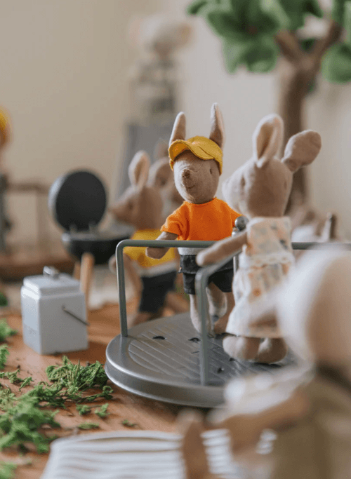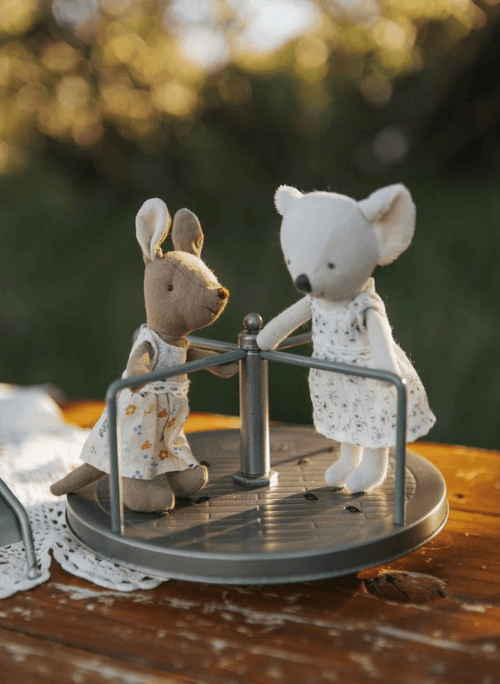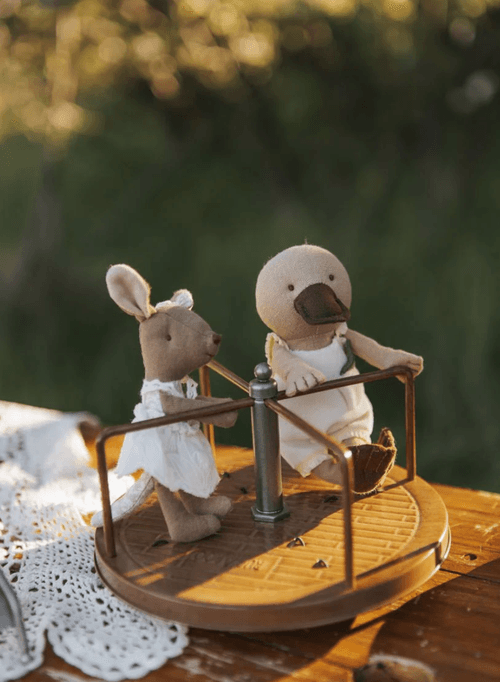 轉轉樂採用耐用、具收藏價值的高品質金屬製作,是能陪伴好幾個世代的經典玩具。每一件皆依照 Rugaroo 娃娃比例精準設計,讓孩子在桉樹間展開迷你公園冒險,或作為嬰幼兒房層架上的質感擺設,都同樣迷人。