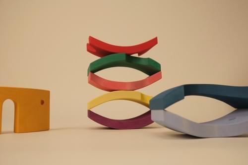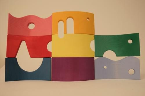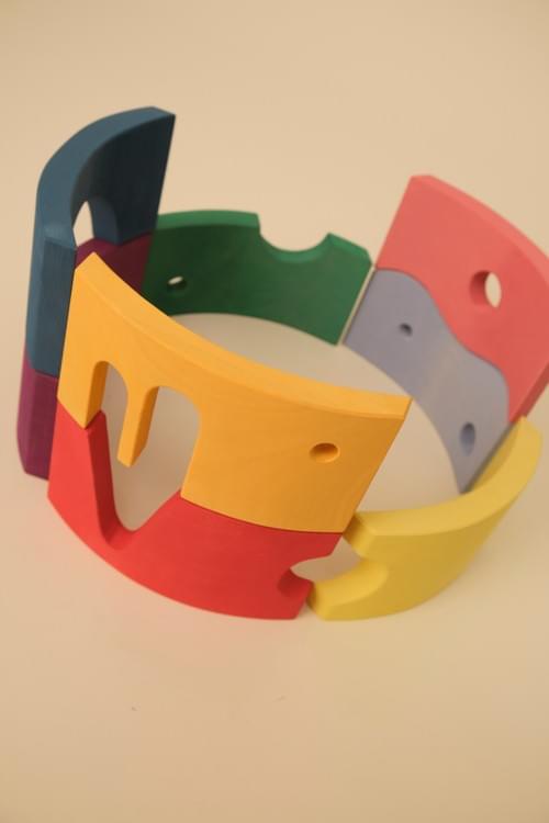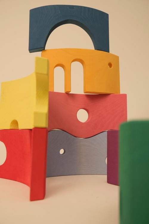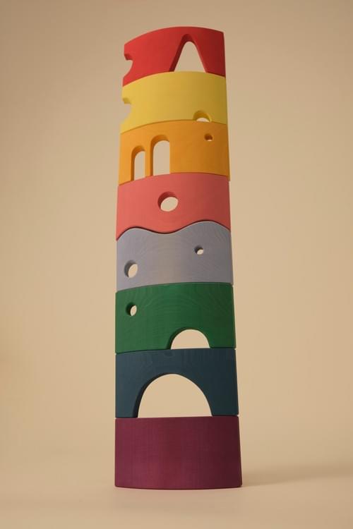 Storyboard 彩虹拱形積木特色在於精心設計的鏤空造型。這些鏤空可在垂直或水平配對組合,拼湊出清晰的視覺輪廓,如:愛心、船、冰淇淋、以及有眼睛和嘴巴的臉。
